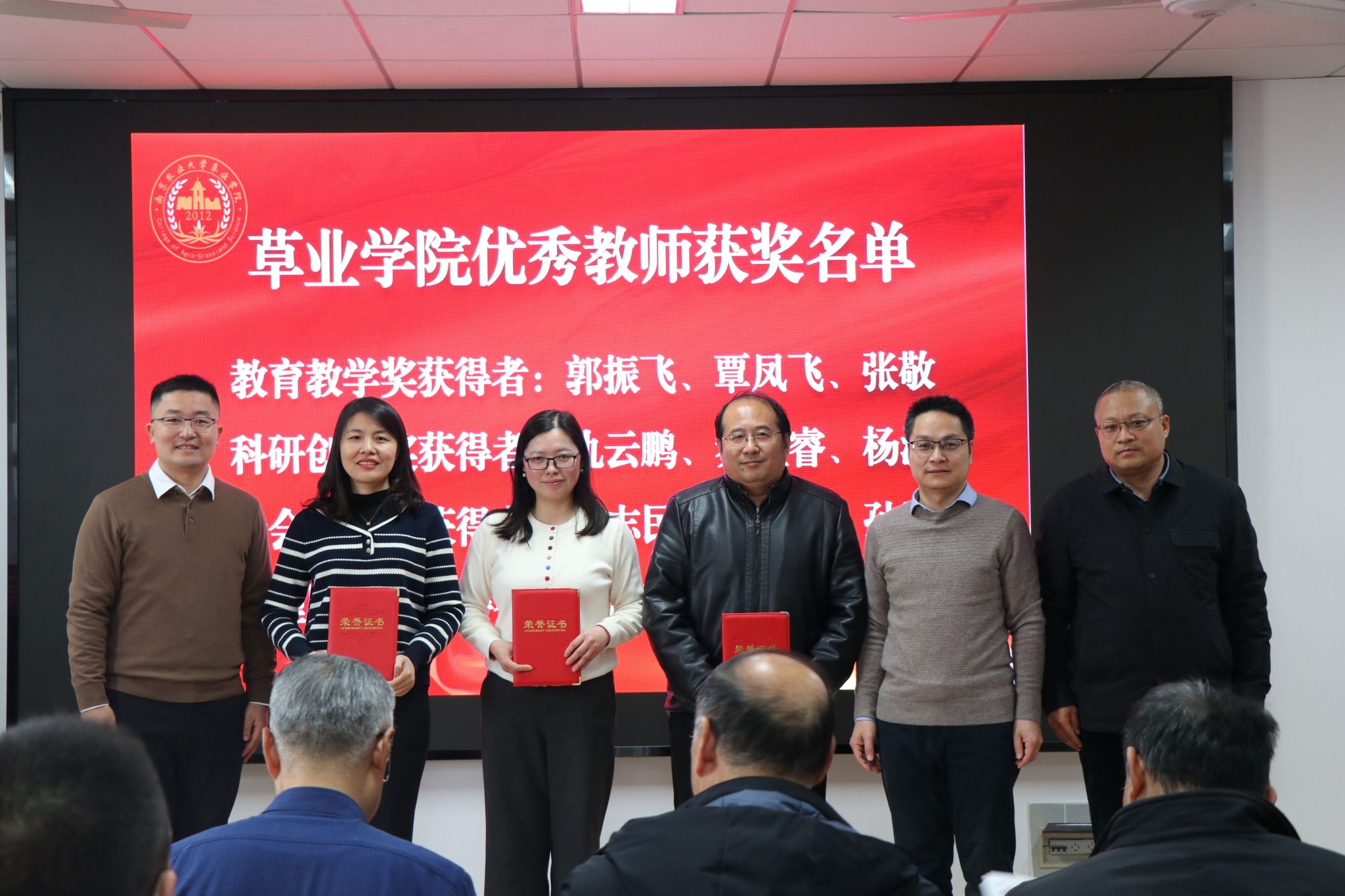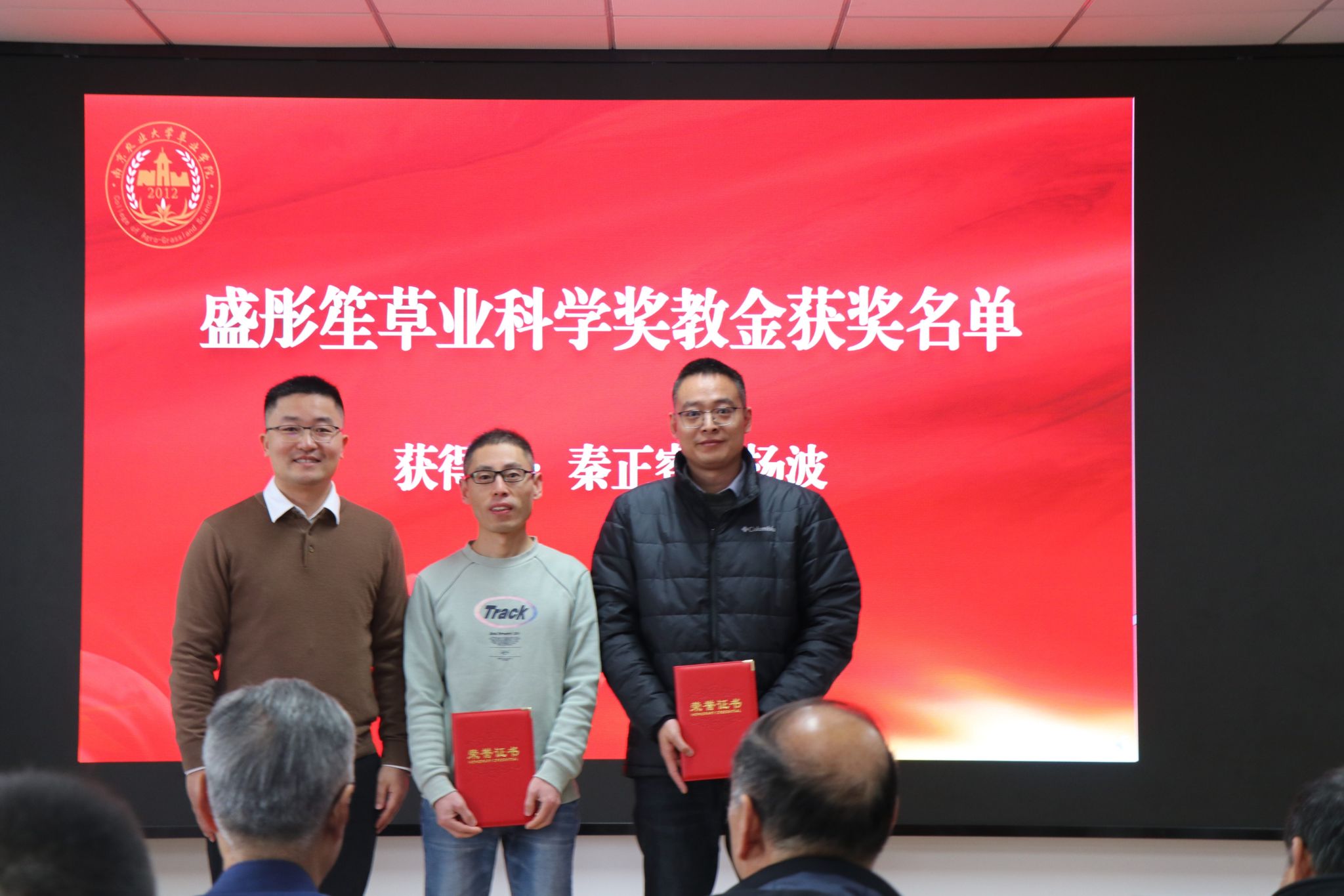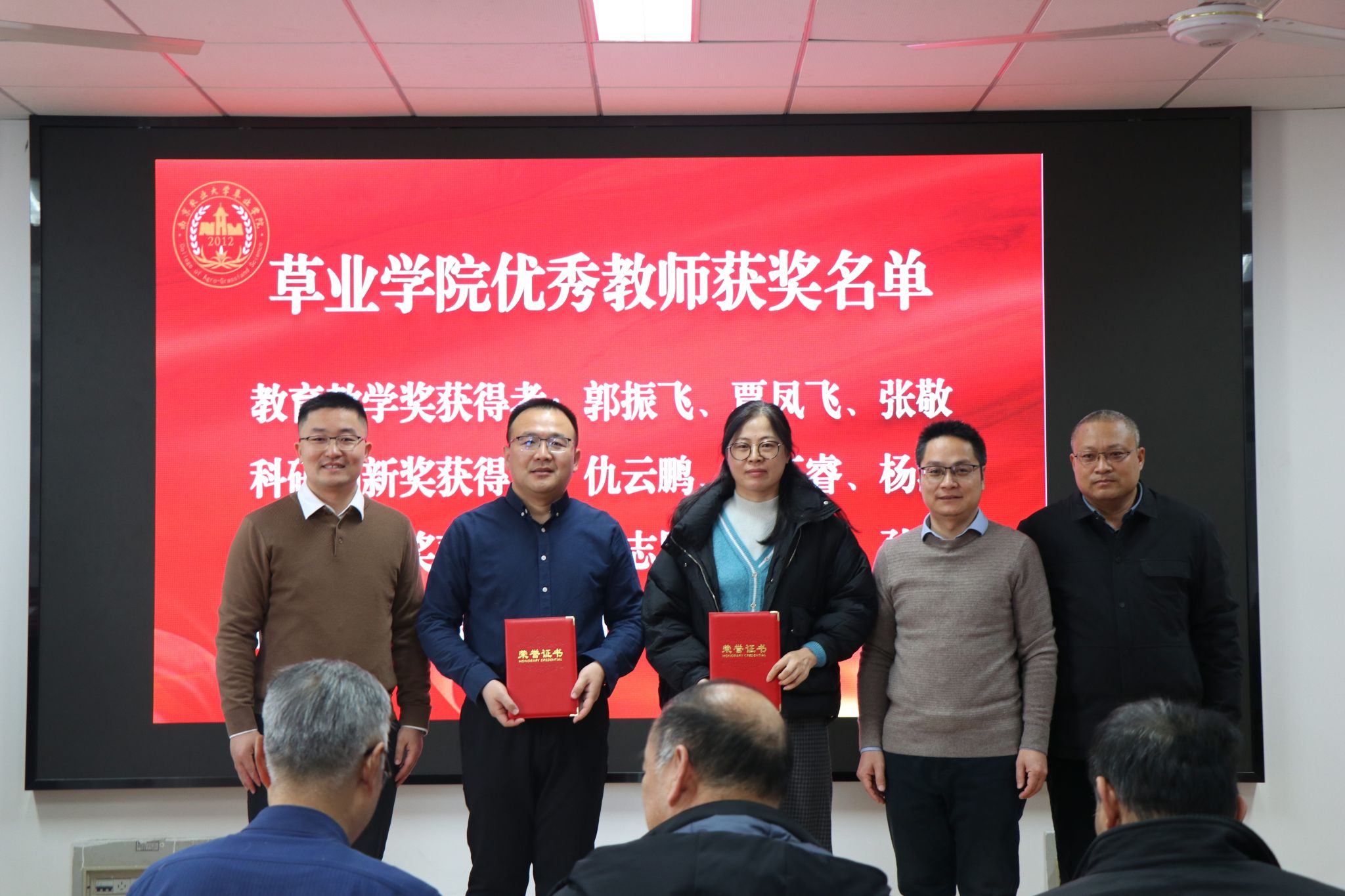 年会对在教育教学、科研创新、社会服务、管理服务等方面做出突出贡献的12位教职工进行了表彰,对盛彤笙草业科学奖教金、奖学金获得者进行了颁奖。尤佩华为获得饲草科学—波杜奖学金的同学们颁发了获奖证书。