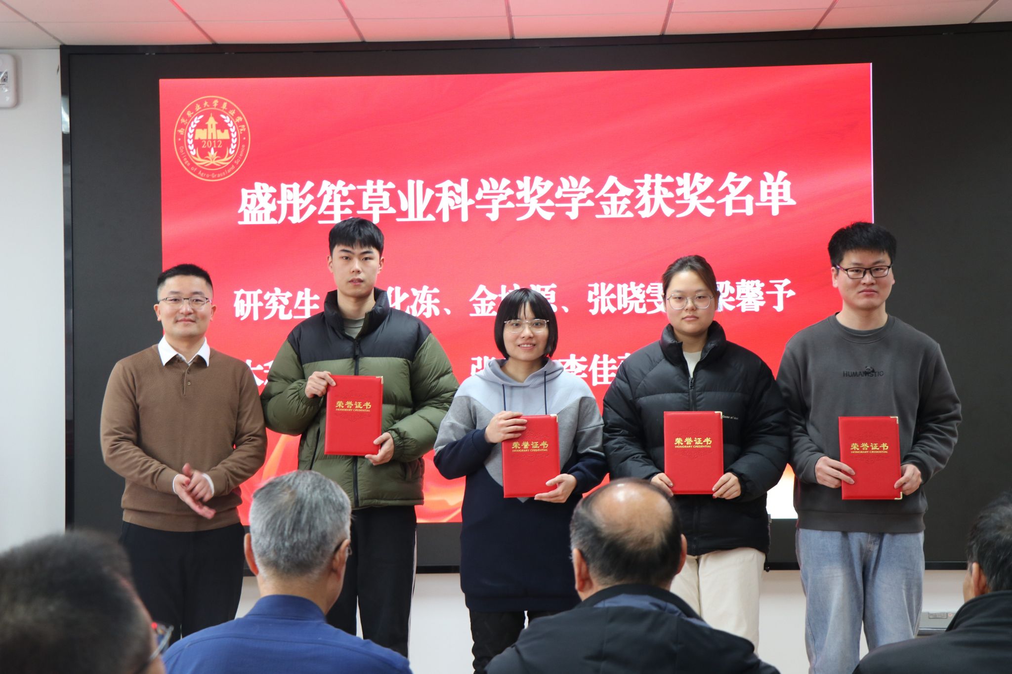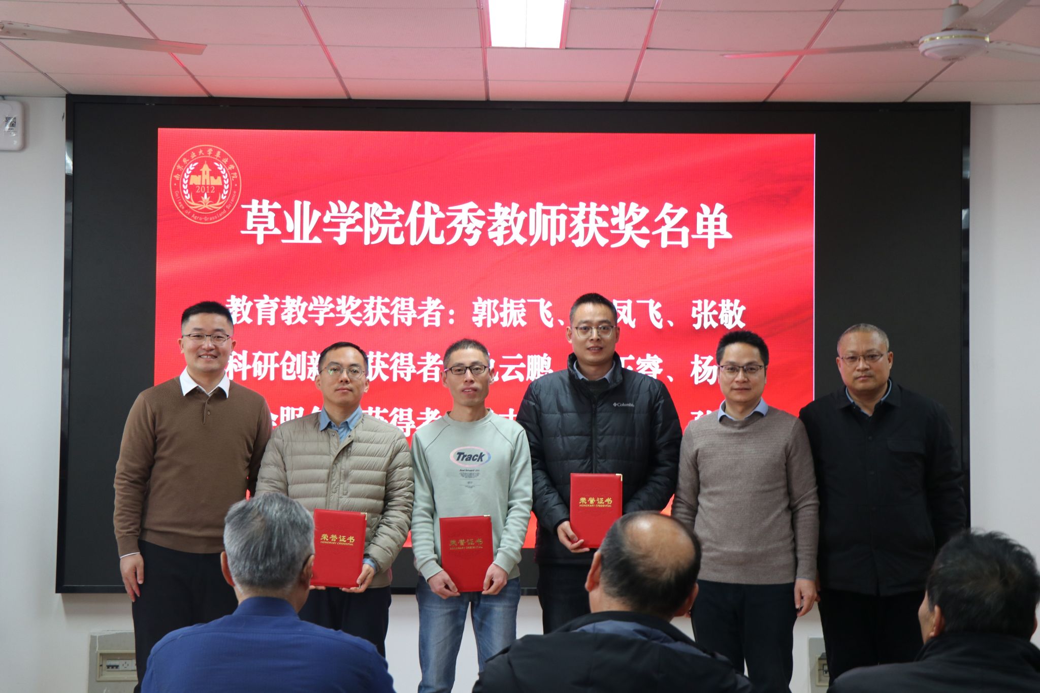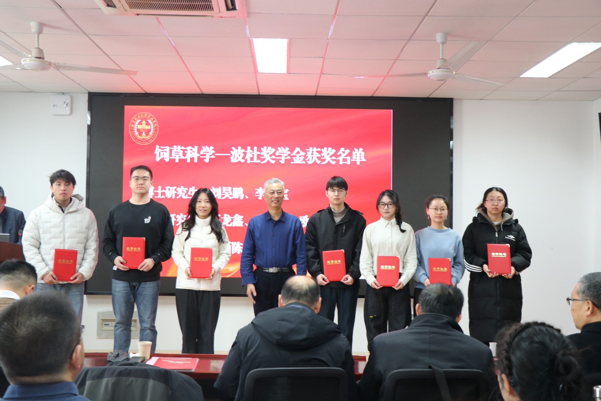 年会对在教育教学、科研创新、社会服务、管理服务等方面做出突出贡献的12位教职工进行了表彰,对盛彤笙草业科学奖教金、奖学金获得者进行了颁奖。尤佩华为获得饲草科学—波杜奖学金的同学们颁发了获奖证书。
