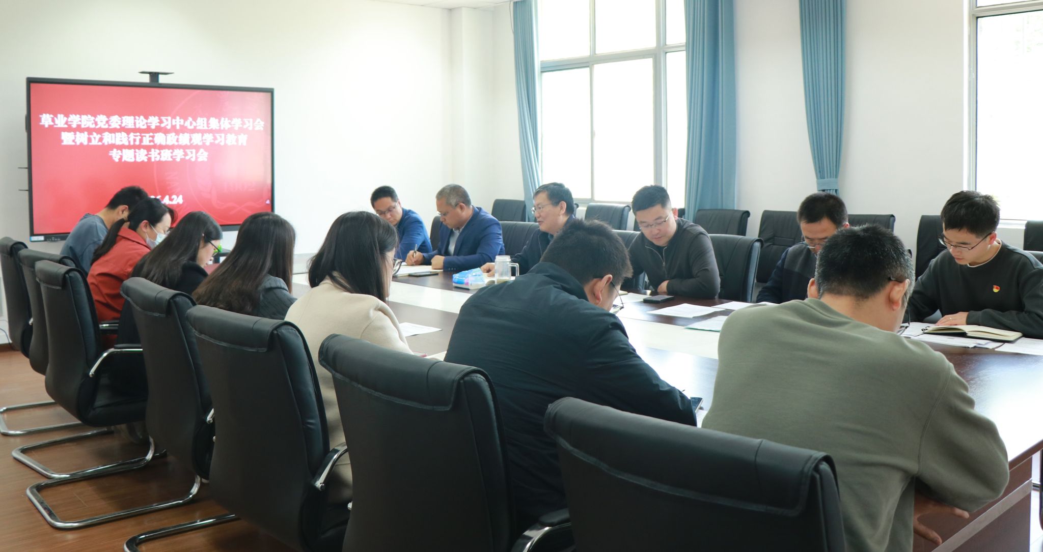 4月24日上午,草业学院在理科南楼F210会议室召开党委理论学习中心组集中学习暨树立和践行正确政绩观学习教育专题读书班学习会。全体院领导、党委委员,党支部书记、办公室主任、学工办主任、党务秘书等参加集中学习。学习会由院党委书记戴廷波主持。