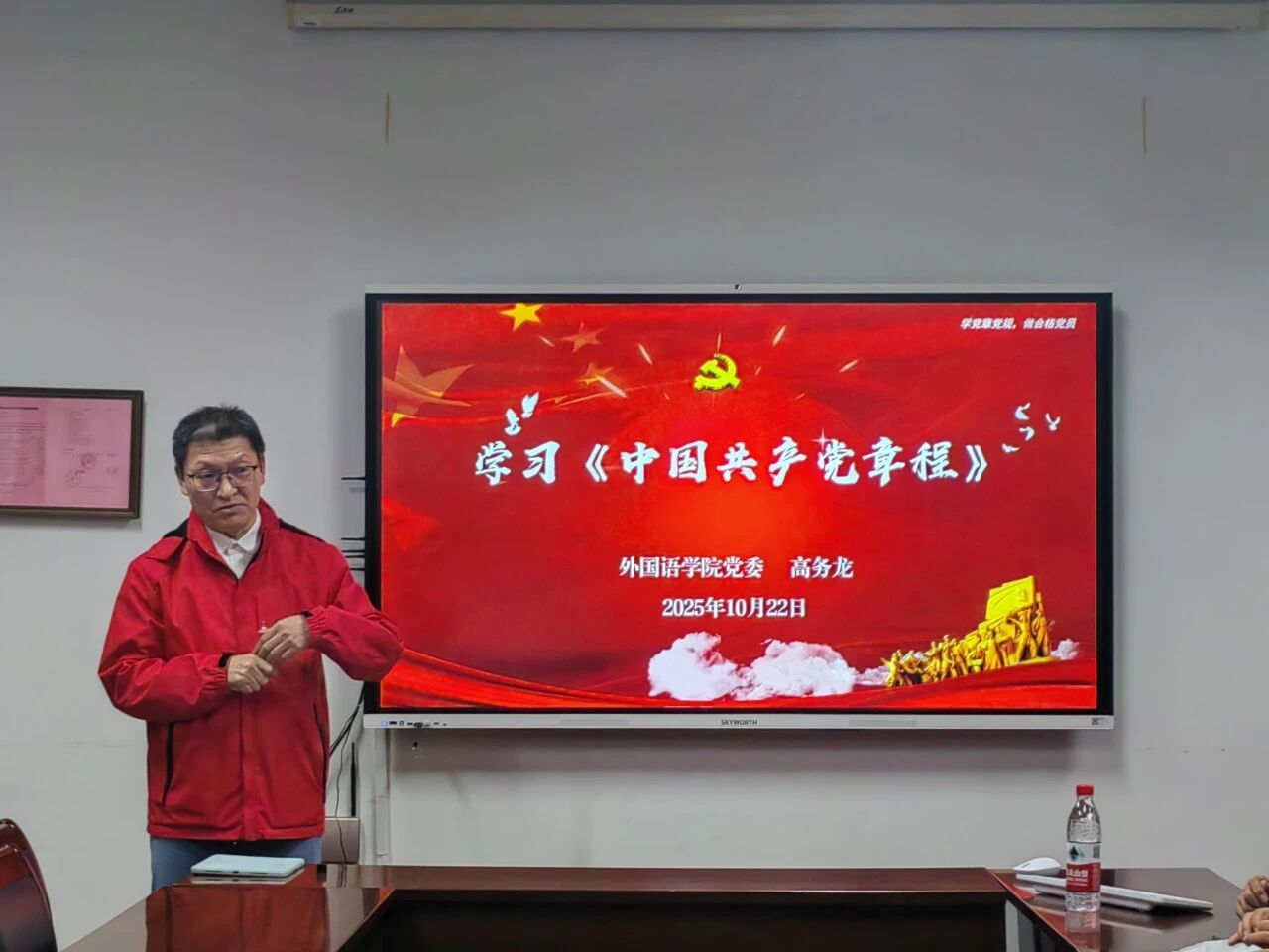 草业学院党委于10月22日在理科南楼F304组织开展《中国共产党章程》专题培训。通过深入学习党章,夯实思想根基,激发青年学生投身农业现代化建设的责任感与使命感。本次培训特邀外国语学院党委副书记高务龙同志主讲。